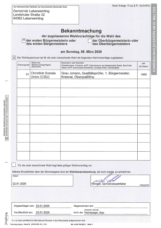 Bekannmtachung der zugelassenen Wahlvorschläge für die Wahl des ersten Bürgermeisters