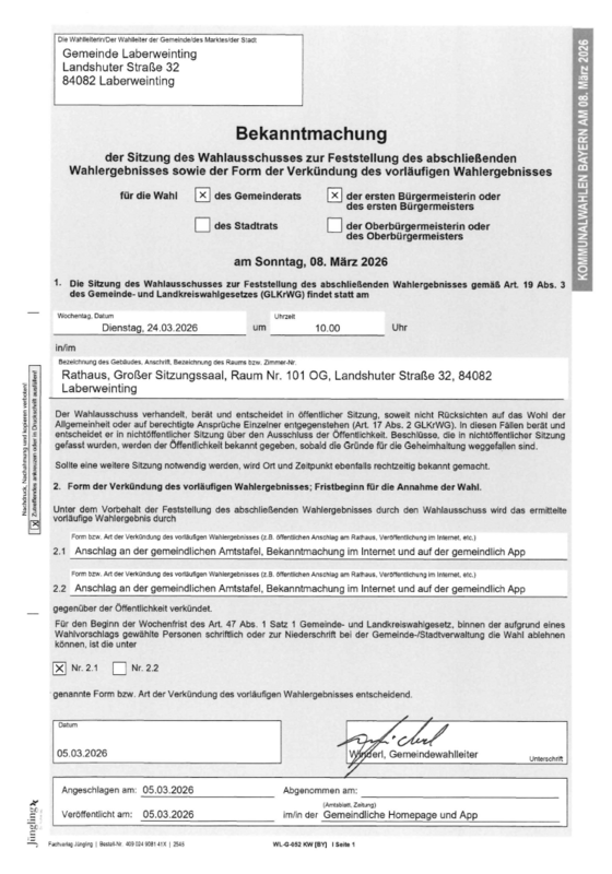 Bekanntmachung über die Sitzung des Wahlausschusses zur Feststellung des abschließenden …